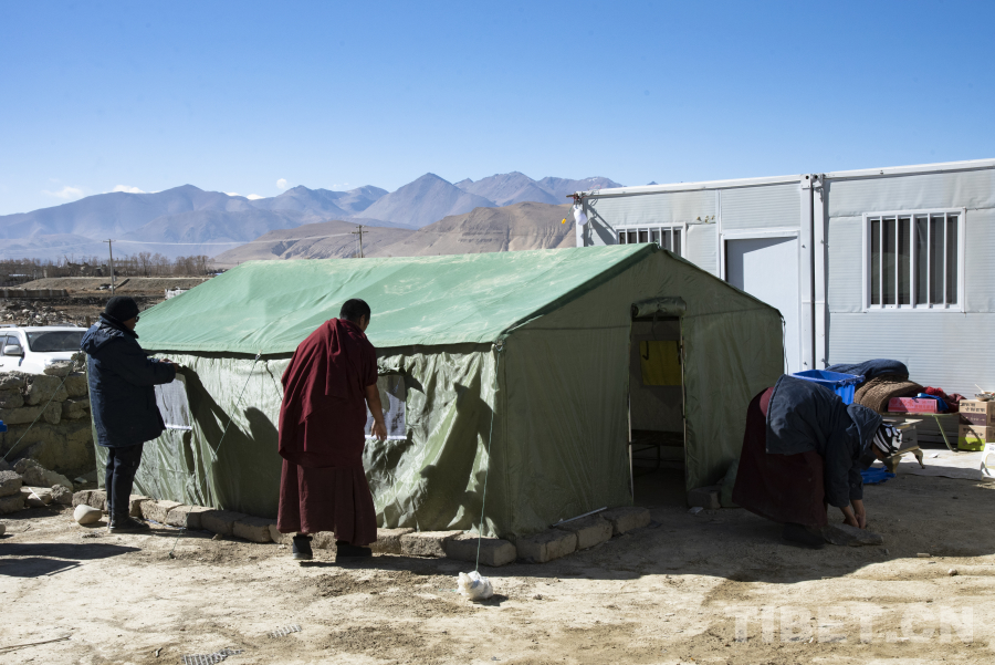 圖為在宗布寺和森嘎曲德寺受災僧尼安置點內(nèi)正在搭建的燃燈房 攝影:趙振宇