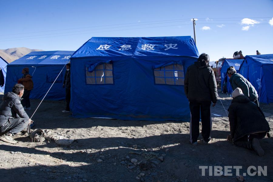 圖為嘎旦村受災村民正在相互幫助搭建安置帳篷(攝于1月8日) 攝影:趙振宇