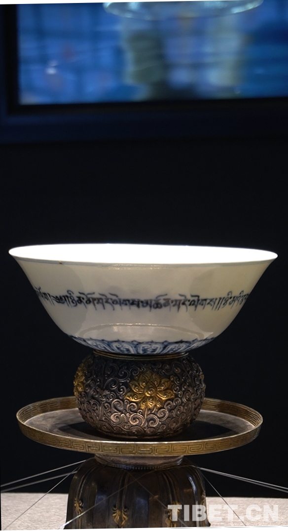 圖為“宣德年制”款青花藏文紋高足碗及銀鏨花紋碗座。高足碗是元代以來(lái)的重要瓷器樣式,這套高足碗外壁一圈書(shū)藏文吉語(yǔ),大意為:日平安,夜平安,三寶永遠(yuǎn)賜平安。碗下側(cè)高足外圈飾蓮花紋,碗底書(shū)有“宣德年制”款,并配有一套錯(cuò)金銀簪花的碗托。風(fēng)格的融合不僅讓這套高足碗擁有跨越地域的文化韻味,更引領(lǐng)著參觀游客探索與欣賞民族交往交流交融帶來(lái)的無(wú)限可能 攝影:張宇