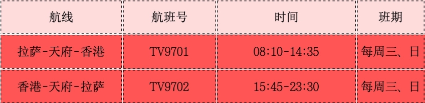 該航線由西藏航空執(zhí)行,計劃每周三、周日執(zhí)飛,航班號TV9701,于8:10拉薩起飛,在天府經停后,14:35到達香港;返程航班號TV9702,于15:45香港起飛,在天府經停后,23:30到達拉薩。