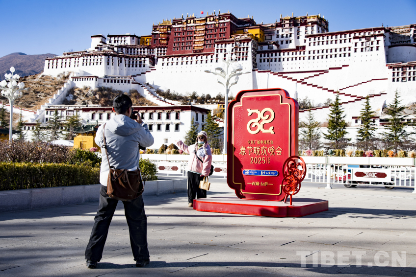 圖為游客在央視春晚西藏拉薩分會場標識前打卡 攝影:趙振宇