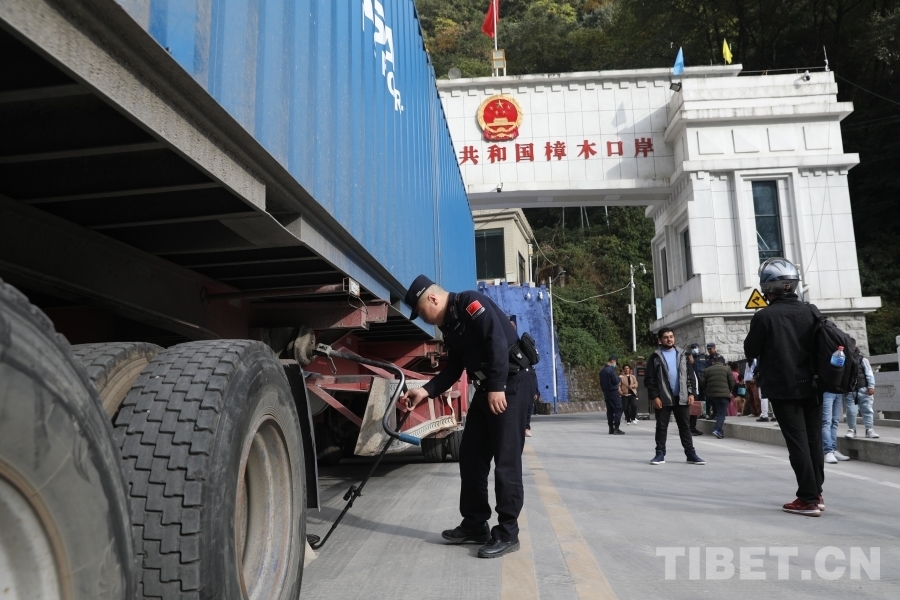 圖為聶拉木邊檢站民警對(duì)出境貨車(chē)進(jìn)行查驗(yàn)