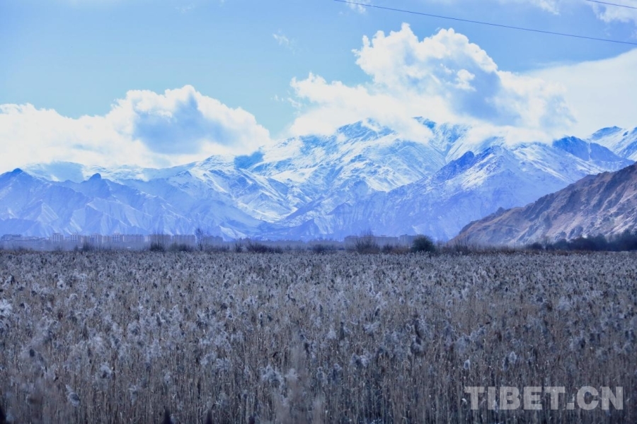 圖為從拉魯濕地遠(yuǎn)眺遠(yuǎn)處銀裝素裹的山巒 攝影:德吉卓瑪