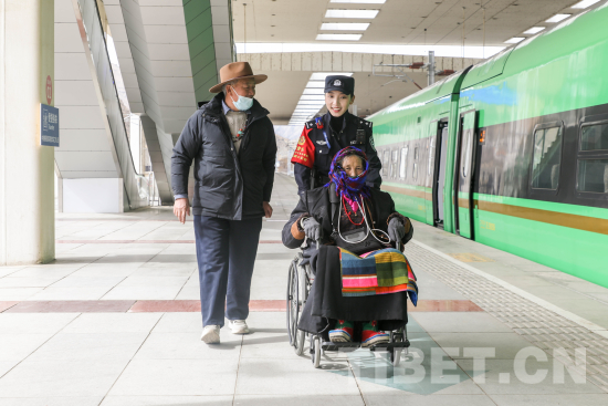 圖為乘警余丹措護(hù)送乘坐輪椅的旅客便捷乘車