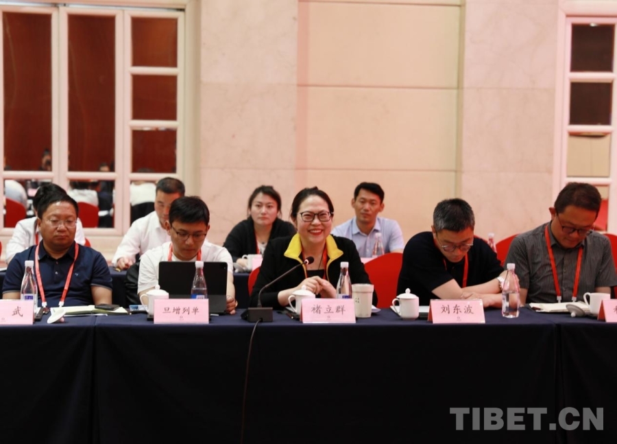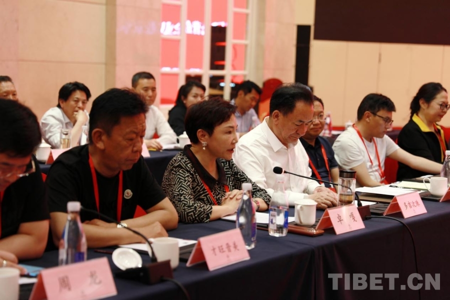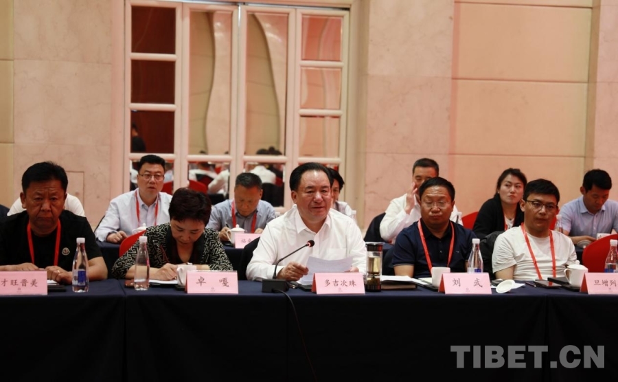 圖為西藏自治區(qū)政協(xié)黨組成員、副主席、區(qū)工商聯(lián)主席、總商會(huì)會(huì)長(zhǎng)多吉次珠(前排左三)發(fā)言 攝影:劉莉