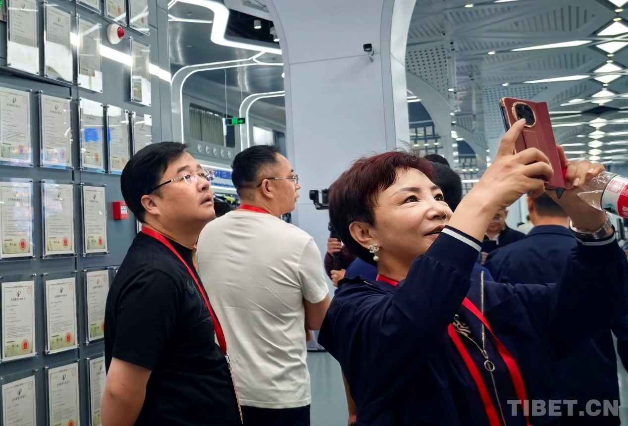 圖為全國政協(xié)委員、西藏自治區(qū)工商聯(lián)副主席、西藏青年企業(yè)家商會會長、西藏眾源建材集團有限公司董事長卓嘎(右一)在北方國際汽車教育展廳+實操教室拍攝發(fā)明專利證書 攝影:劉莉