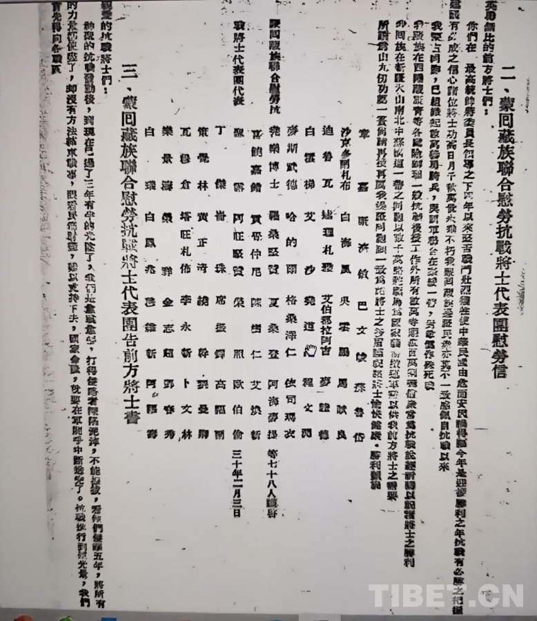 撫今追昔,再讀1941年2月由蒙、回、藏等各民族代表(藏族代表有喜饒嘉措、阿旺堅贊、貢覺仲尼、羅桑堅贊、格桑澤仁、丁杰、倫珠、策覺林、黃正清、劉曼卿、鄧春秀、繞干等)聯(lián)署的《蒙回藏族聯(lián)合慰勞抗戰(zhàn)將士代表團告前方將士書》(以下簡稱《告前方將士書》)(原擬赴各戰(zhàn)區(qū)慰問前線將士,因交通關(guān)系,未能成行),深感它不僅是一封跨越地理阻隔的致敬信,更是一曲蕩氣回腸的民族精神交響曲。當(dāng)我們將目光聚焦于這份文獻本身,會發(fā)現(xiàn)其中蘊含的精神力量至今仍在激蕩。
