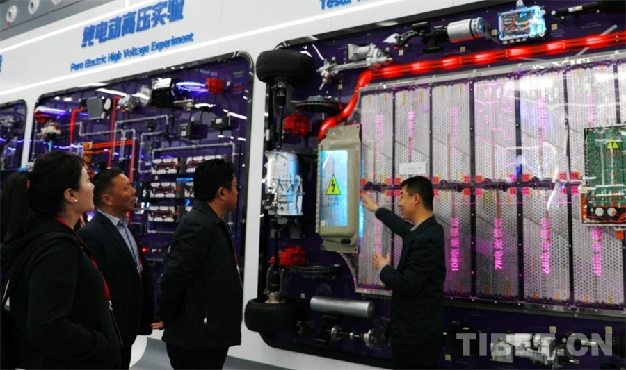 “這是由7104節(jié)電池組成的特斯拉的電池組,它是402伏的高壓電。所以,沒有經(jīng)過專業(yè)培訓(xùn)進(jìn)行電動汽車維修會有一定的危險性?!北狈絿H汽車教育展廳、車間負(fù)責(zé)人黨超為到訪的西藏自治區(qū)工商聯(lián)民營企業(yè)家赴京學(xué)習(xí)參觀團(tuán)一行詳細(xì)介紹著墻上展示的電池組。大家聽得津津有味。