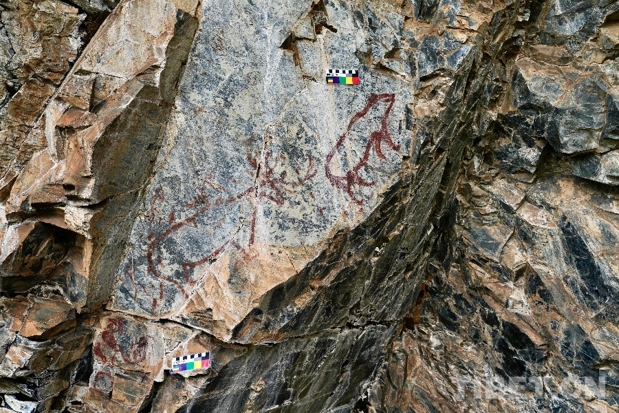 圖為2023年6月24日拍攝的甘孜州“海子山-格聶巖畫群”海1巖畫中獨特的野豬、人物、爪印圖像