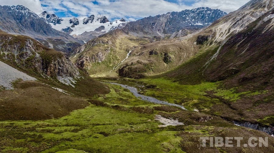 圖為2023年6月24日拍攝的甘孜州“海子山-格聶巖畫群”大環(huán)境,遠處為格聶群峰