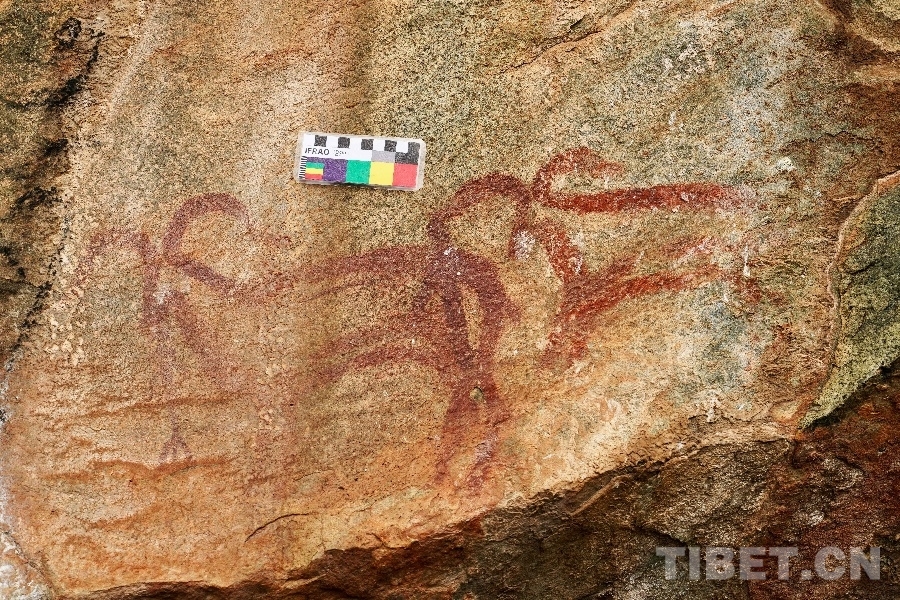 周行康:西藏7地市里,阿里地區(qū)的巖畫得到比較早的發(fā)現(xiàn)與重視,20世紀90年代考古學家在做其他考古項目時發(fā)現(xiàn)了這個現(xiàn)象并進行了一定的研究,然后是包括那曲在內(nèi)的廣義羌塘地區(qū)。青海玉樹州的巖畫在十年前開始得到比較多的重視,主要是本地的藏族同志在認真地調(diào)查研究。最近三、四年,甘孜州的巖畫在當?shù)卣匾暋<覍W者的參與下進入上升趨勢,甘孜州涂繪類巖畫的測年工作是走在青藏高原巖畫研究前列的。目前看青藏高原西、中、東三個重要點位已具備規(guī)模和形態(tài)。