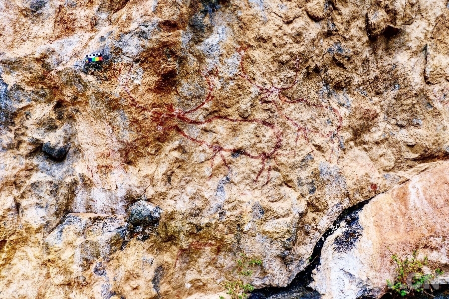 周行康:2023年6月,在海子山管委會巡山團隊提供線索指引下,經(jīng)過數(shù)次實地調(diào)查,我們在“海子山-格聶”區(qū)域發(fā)現(xiàn)了紅顏料涂繪類巖畫群。通過邀請國內(nèi)考古權(quán)威機構(gòu)來現(xiàn)場采樣、并經(jīng)實驗室測定,我們確認這批巖畫是距今8000年前的古老創(chuàng)作。目前從世界范圍來看,石刻類巖畫的測年還沒有得到一個有效的解決,青藏高原的石刻類巖畫,一般推斷為距今3000多年,因而這批更久遠的舊石器時代的“海子山-格聶”巖畫就顯得更有意義,而且它是目前已知的世界上同類風格巖畫中海拔最高的巖畫——位于海拔4721米的高度。