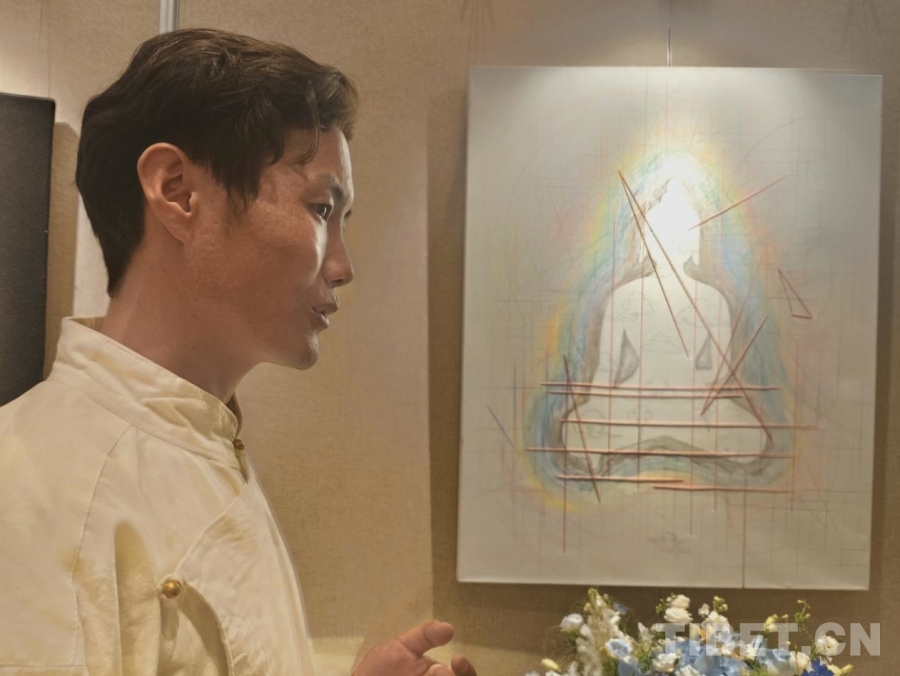 圖為5月2日至8日舉行的“三國同框 四季如畫 五彩亞東——亞東縣文化交流及特色產(chǎn)品展銷活動”上,亞東青年藝術(shù)家索喃次仁在介紹他的作品 攝影:趙釗