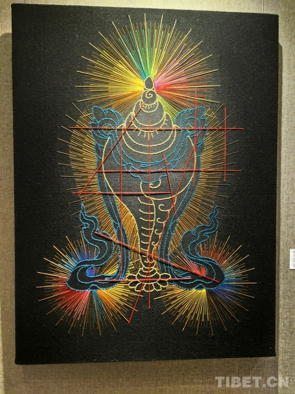 索喃次仁的作品慣以手工羊絨布為面,彩色羊毛線為語言,呈現(xiàn)標(biāo)志性的“彩虹”元素。“(西藏)傳統(tǒng)的藝術(shù)是有一定標(biāo)準(zhǔn)的,而當(dāng)代藝術(shù)是可以無界的,包括材質(zhì)、材料都可以有所創(chuàng)新,是表達個人情感和生活的一種藝術(shù)形式。我常常問自己,能不能突破傳統(tǒng)?可不可以做一些比較新的東西?像我現(xiàn)在創(chuàng)作選擇用羊絨布,就是我的一種情感表達,因為(它)與我的家鄉(xiāng)有深切關(guān)系?!彼鬣稳式忉尩?/span>:“比如說這一幅作品,佛像外呈現(xiàn)出一種彩虹的狀態(tài)。因為彩虹本身是一個無常的現(xiàn)象,而我之前學(xué)過唐卡佛像,所以把佛像和彩虹理念結(jié)合了,這既是一種傳承,也是突破?!?/span>