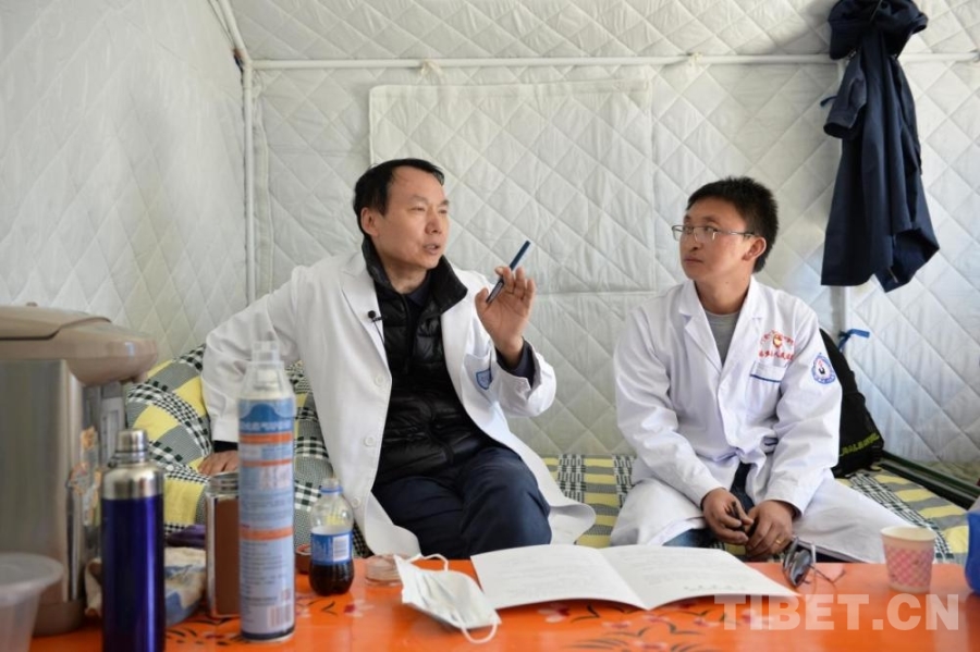 圖為2021年,余震中,王建六(左)帶領(lǐng)團(tuán)隊(duì)赴青海省瑪多縣開展宮頸癌篩查,在帳篷辦公室里與當(dāng)?shù)蒯t(yī)務(wù)工作者交流 北京同心共鑄公益基金會(huì)供圖