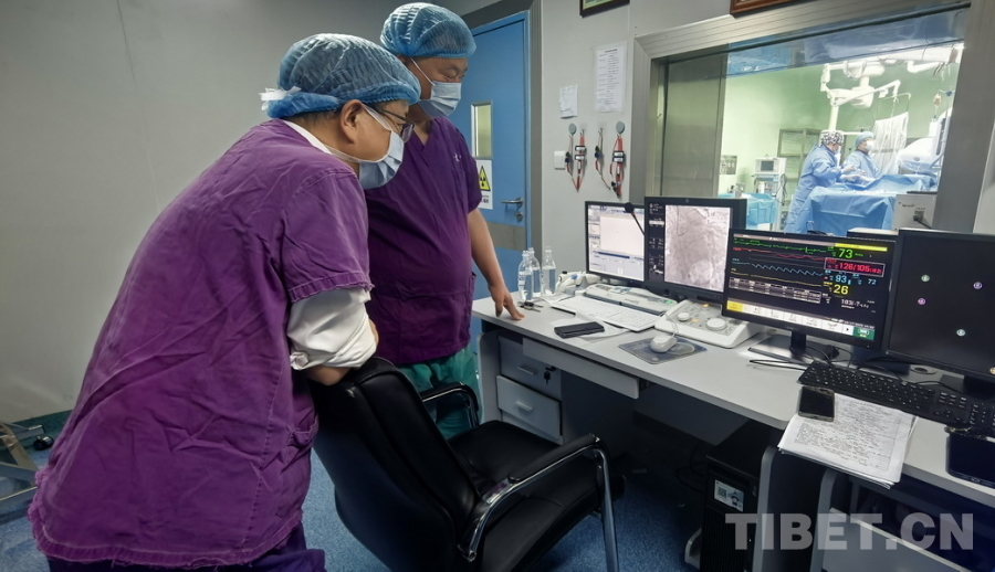 圖為陰赪茜(手術室內右)趕赴阿壩州人民醫(yī)院手術救治急性心?;颊撸沃萑嗣襻t(yī)院院長、主任醫(yī)師楊林(左)與心內科主任、主任醫(yī)師李方安密切關注手術進展 攝影:劉莉