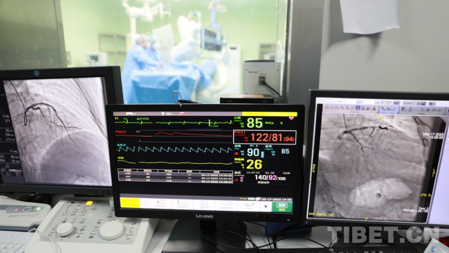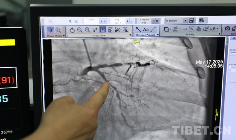 圖為陰赪茜趕赴阿壩州人民醫(yī)院手術救治急性心梗患者,屏幕上顯示出患者心臟血管多處問題嚴重 攝影:劉莉