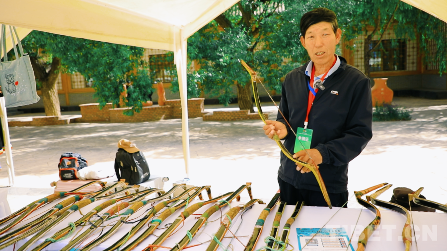馬國財(cái)是一位來自青海省海東市樂都區(qū)的南山傳統(tǒng)牛角弓非遺傳承人,自曾祖父起他家在制作牛角弓方面的技藝是家喻戶曉的。他深受父輩的影響,做弓技藝更是嫻熟。此次活動(dòng),他帶來了自己的幾十張得意之作“南山傳統(tǒng)牛角弓”,在現(xiàn)場向?qū)ε=枪信d趣的游客耐心地講解選材、打磨、粘合、鋪筋、扎把、陰干、調(diào)試、加牛角、打磨、貼樺皮、上色等弓箭的制作過程,以及在生活當(dāng)中的實(shí)際應(yīng)用,讓更多的人了解到它不僅僅是一張普通的弓,更是祖祖輩輩的智慧結(jié)晶和珍貴非遺。