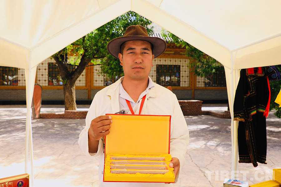 “我今天主要帶來的是我們的工藝產(chǎn)品‘供養(yǎng)藏香’,這些包裝樣式不一的藏香根據(jù)規(guī)格大小都有各自的價(jià)位,但每一根藏香上付出的心血及所使用的工藝和配料都一致,其中我們也更注重藏香的配料,都是精心篩選的白檀香、藏紅花、安息香、白黑沉香、甘松等二十多種源自高原的天然藥物和香味植物?!碑?dāng)問到目前的銷售情況時(shí),他坦言道:“今天賣出去的并不是很多,不過今天能和眾多的優(yōu)秀手工藝人同臺(tái)參展機(jī)會(huì)難得,對(duì)我來說也是一種學(xué)習(xí)和展現(xiàn)的契機(jī)?!?/p>