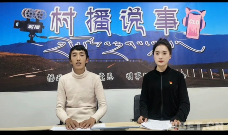 圖為次仁嘎措與她的搭檔在播《村播說(shuō)事》 受訪者供圖