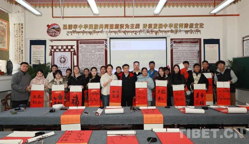 走進(jìn)西藏民族大學(xué)社科樓里內(nèi)的“鑄牢中華民族共同體意識(shí)書(shū)法實(shí)踐基地”,基地負(fù)責(zé)人扎西曲杰正帶領(lǐng)他的小伙伴書(shū)寫(xiě)書(shū)法作品。指著一幅幅書(shū)法作品,扎西曲杰自豪地說(shuō),我們基地的各族學(xué)生用“寫(xiě)”在一起的形式傳承中華優(yōu)秀傳統(tǒng)文化,推廣國(guó)家通用語(yǔ)言文字,助力中華民族共同體建設(shè)。