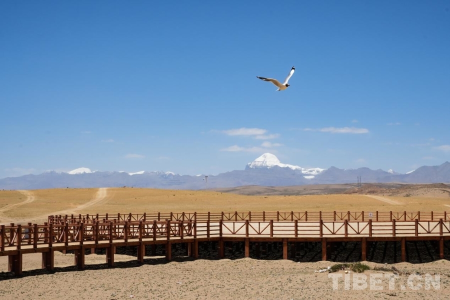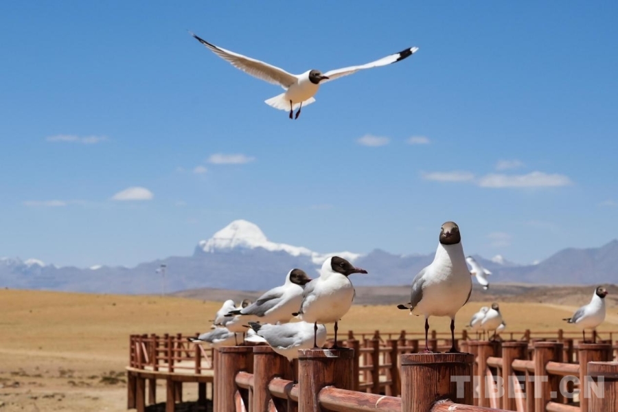 圖為立于瑪旁雍錯(cuò)旁棧道上的棕頭鷗群,遠(yuǎn)處是岡仁波齊峰 攝影:邊子捷