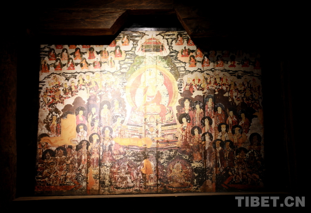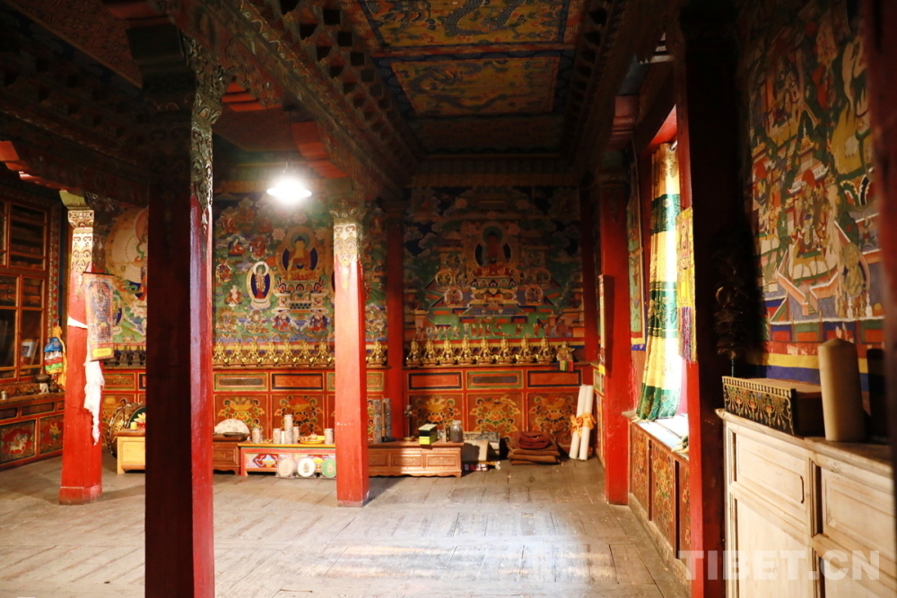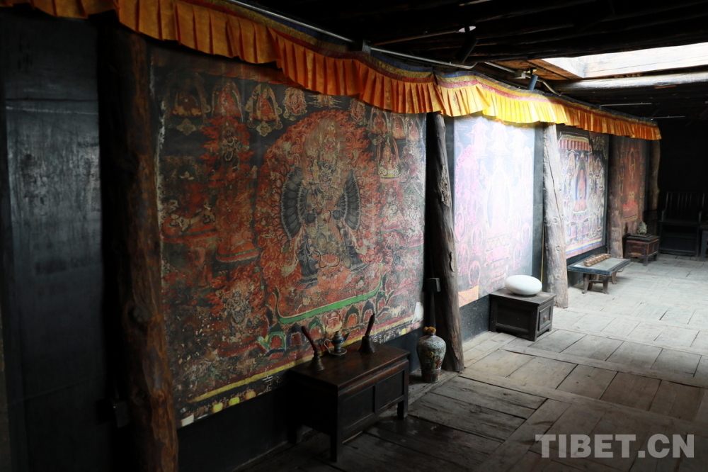 宗薩木府最驚艷的是其經(jīng)堂中歷經(jīng)380余年歷史仍色彩絢麗、保存完整的整堂壁畫。新中國(guó)成立后,宗薩木府曾被收歸公有,許多無房的當(dāng)?shù)刎毨罕姳话才抛∵M(jìn)了這里。“文革”時(shí)期,宗薩木府的經(jīng)堂被作為村里的倉庫,人們用報(bào)紙糊住壁畫,使這些藝術(shù)珍品沒有受到“破四舊”的影響。