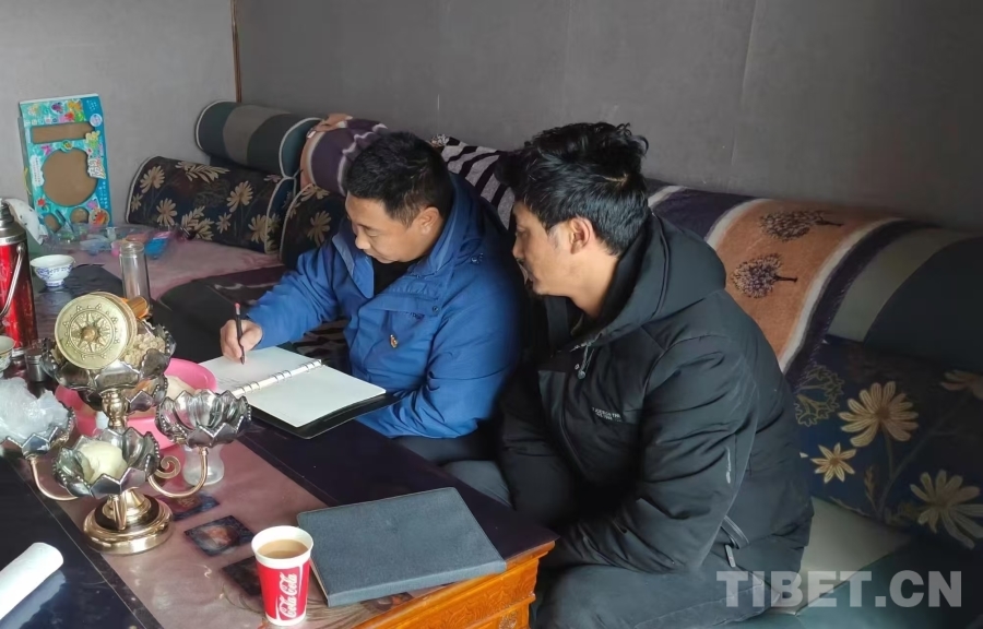 圖為老沙開周(左)在當(dāng)曲村管護(hù)員家中了解相關(guān)工作
