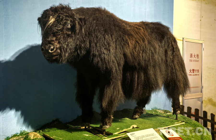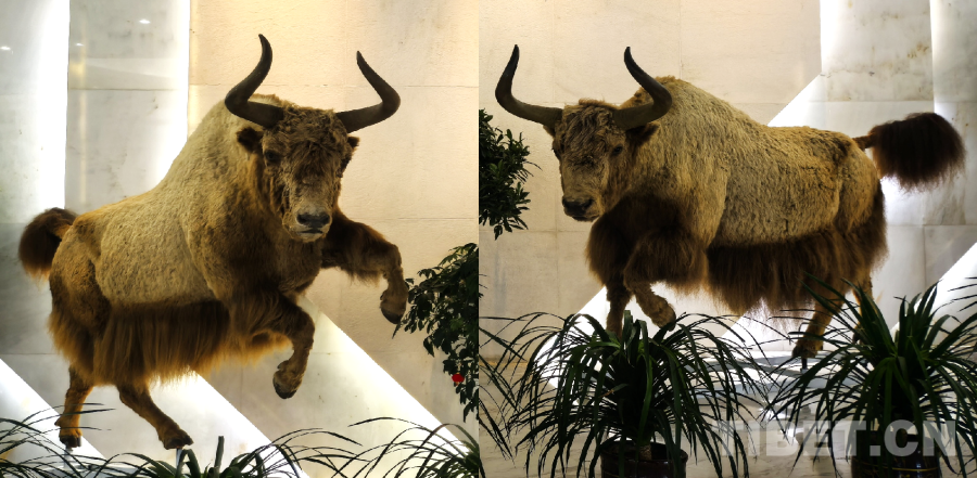 圖為西藏牦牛博物館大廳里陳列的兩頭巨大的金絲野牦牛標(biāo)本。圖左的約16-17歲,體型較大;圖右的接近20歲,體型較小 攝影:劉莉
