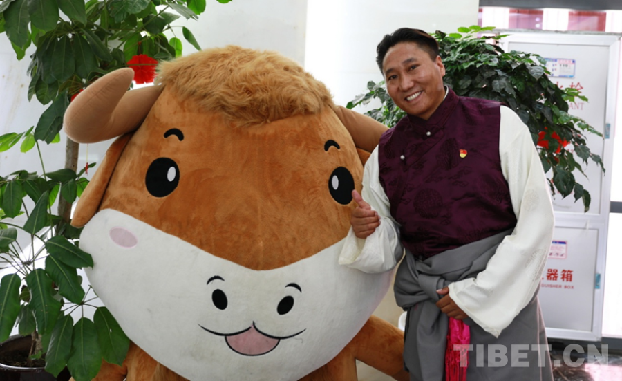 圖為西藏牦牛博物館藏品管理研究部負(fù)責(zé)人西熱與該館以金絲野牦牛形象創(chuàng)作的吉祥物之一合影 攝影:劉莉