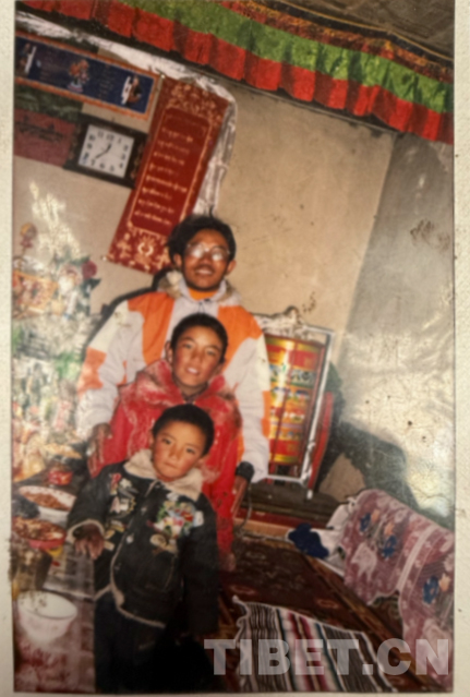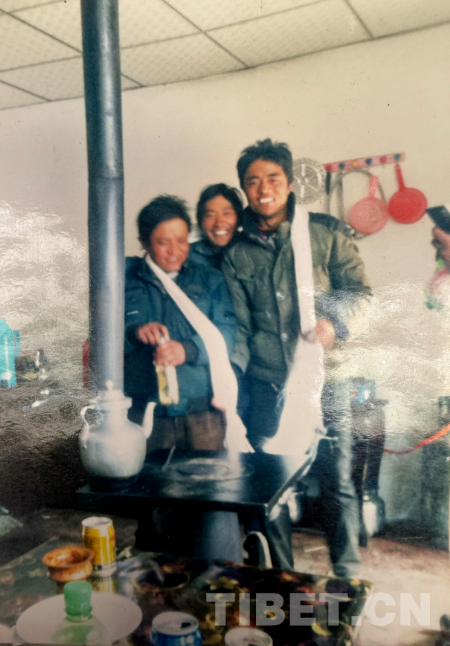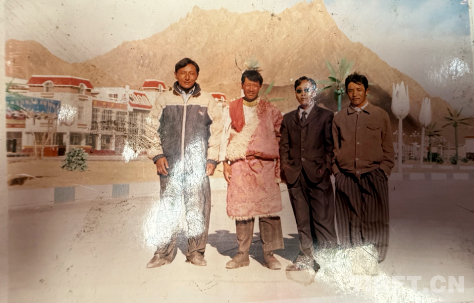 這是九十年代在阿里拍的,拍攝地點是現(xiàn)在的康樂新區(qū)。從照片上可以看到,那時候阿里建設(shè)得挺好。右邊第一個穿燈籠褲的是我。這種褲子當(dāng)時特別流行,年輕小伙子們穿上可高興了。穿藏袍的是我弟弟,那時他還是個普通牧民,后來通過自己的努力,已經(jīng)是我們的村長了。戴墨鏡的是我們同村的,開車時和人發(fā)生沖突打壞了眼睛,去內(nèi)地治療花了十多萬。后來因為眼睛問題駕照被注銷,也就沒辦法繼續(xù)開車了,現(xiàn)在在拉薩當(dāng)保安。當(dāng)時他正好在阿里開出租車,我們找到他一起拍了這張照片。左邊的大個子現(xiàn)在開了個商店和茶館,生意不錯。