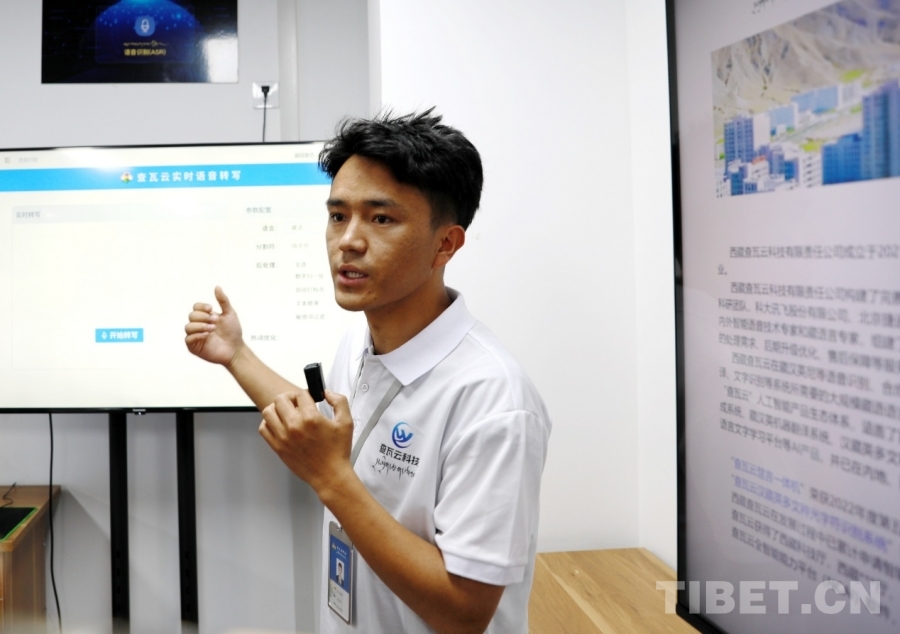 圖為西藏查瓦云科技有限責任公司副總經(jīng)理次仁桑珠介紹查瓦云實時語音轉(zhuǎn)寫系統(tǒng) 攝影:劉莉