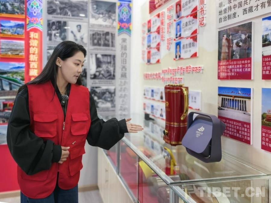 在社區(qū)回憶館內,有一排展柜精心展出了歷年來中央代表團贈予西藏各族各界干部群眾的禮物。從西藏自治區(qū)成立三十周年時的鐘表,到西藏自治區(qū)成立六十周年時的全自動酥油茶壺,德吉措姆說這些禮物滿載著黨中央對西藏各族群眾深情厚誼,每一件禮物都是當時各族群眾日常生活所切實需要的,禮物的變化也見證著西藏各族群眾生活的變化。