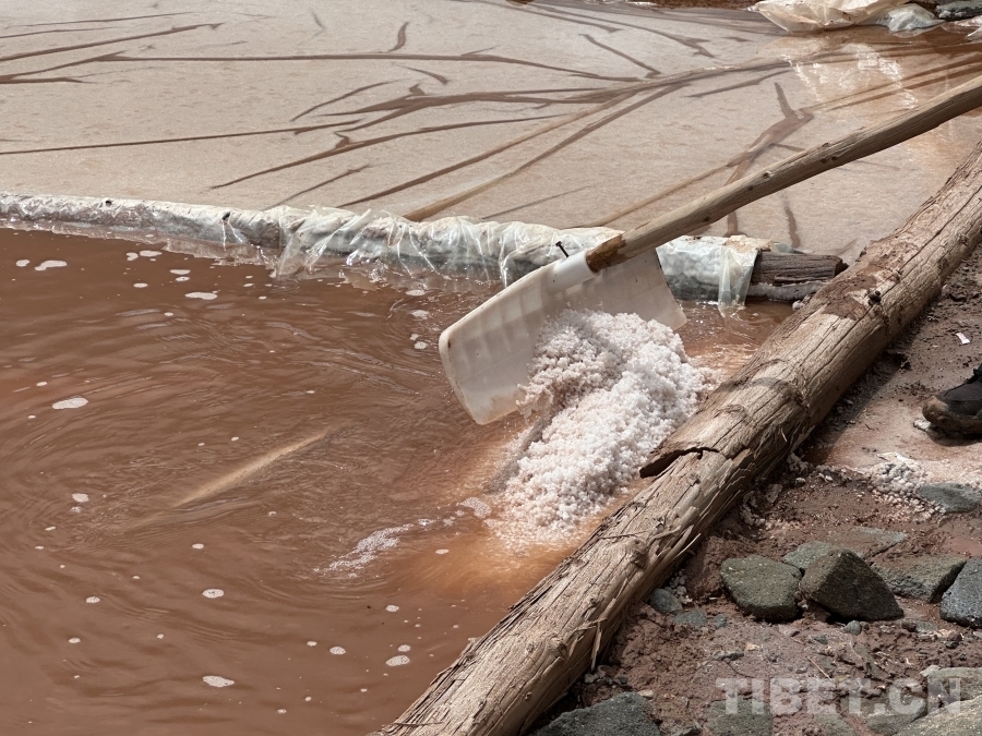 白扎鹽場(chǎng)出產(chǎn)的鹽有白鹽與紅鹽兩種,圖為江羊巴桑正在向我們展示白鹽的制取過程。可以看到,盡管鹵水呈現(xiàn)較深的紅褐色,但初步制取的鹽仍然呈現(xiàn)雪白的顏色。攝影:畢然