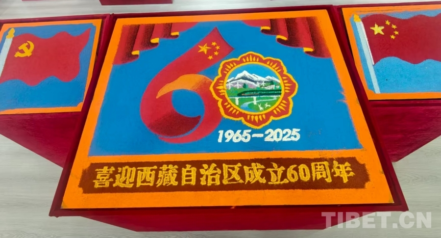 圖為孝登寺鑄牢中華民族共同體意識(shí)展覽館內(nèi),該寺僧人特別為西藏自治區(qū)成立60周年精心自制的沙畫(huà)