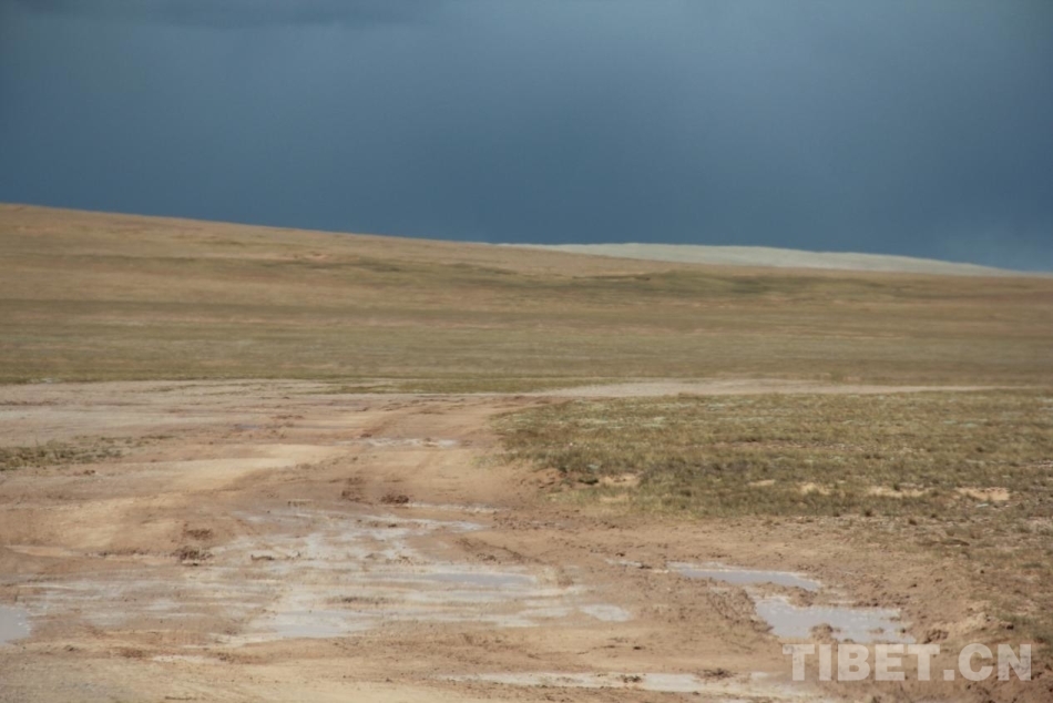 無(wú)人區(qū)的天氣是片段式的,前腳還晴著,下步走進(jìn)一塊雨云下,車子就又會(huì)被淋個(gè)透。我們的車就中招了,在一片黑云壓頂后,刷刷的小雨下了起來(lái),不久又變成了冰雹。小小的冰塊砸在路上融化,很快就把干的泥土裹了起來(lái),路上頓時(shí)變得泥濘不堪。如果說(shuō)石子路的顆粒感顛得人頭暈,那么雨后泥路就黏黏糊糊的,車子仿佛在浸滿水的海綿上走,快不了,也起不來(lái)。漸漸地,雨水大起來(lái),漸漸匯成小溪,車輛駛過(guò),又是一片水花四濺。
