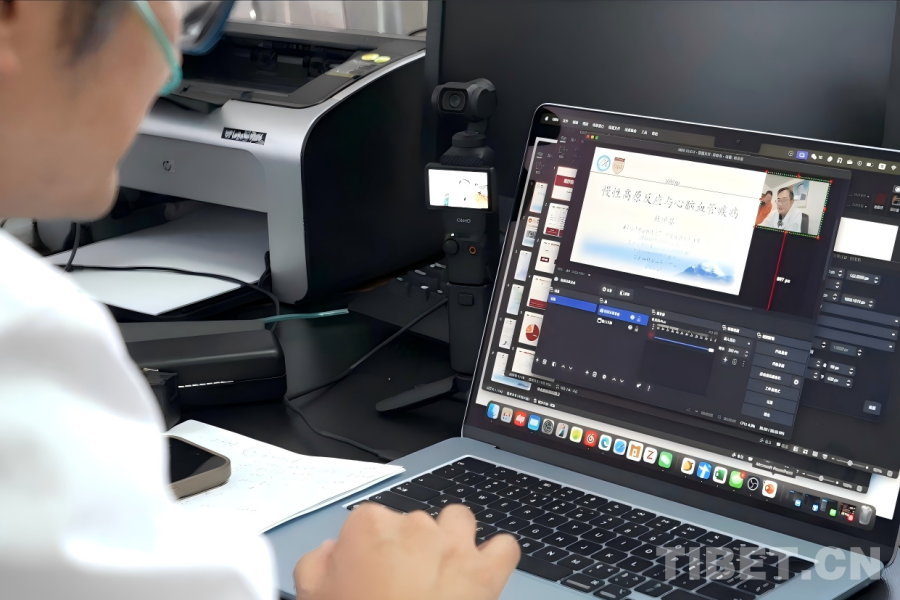 在阿里地區(qū)人民醫(yī)院的行政樓辦公室內,來自上海華山醫(yī)院神經外科、作為第25批“博士服務團”成員援藏的主治醫(yī)師杜倬嬰,正專注研究一項“新技術”。桌面上,一臺口袋相機運行著,旁邊電腦屏幕上同步顯示相機所拍攝的畫面,同時呈現(xiàn)的還有一份關于高原反應與心腦血管疾病的課程講義?!斑@是一套直播系統(tǒng),不過我現(xiàn)在還在學習怎么使用?!爆F(xiàn)任阿里地區(qū)人民醫(yī)院黨委委員、副院長的杜倬嬰笑著展示初見雛形的成果。