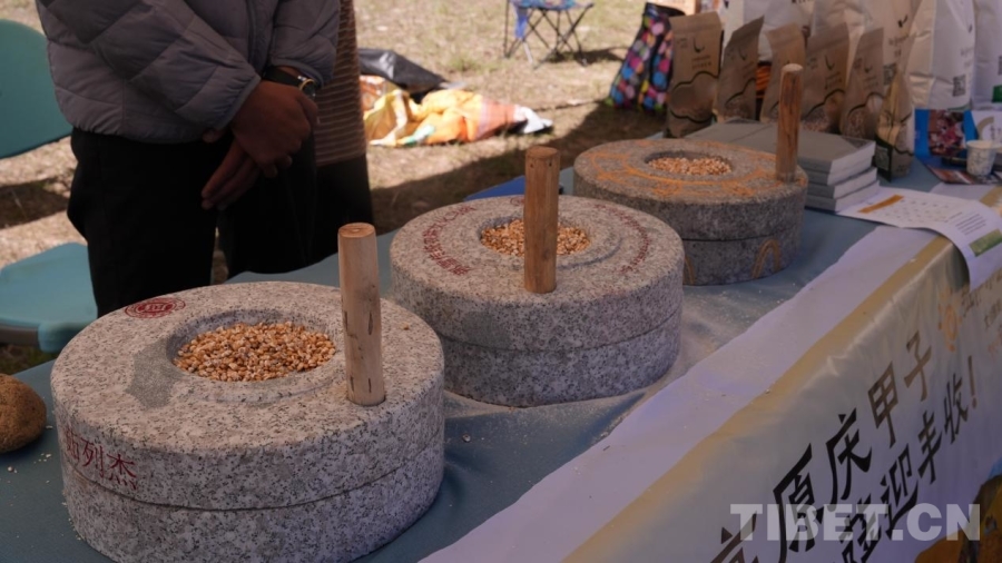 圖為茹列杰展銷點展示的磨糌粑用的石磨