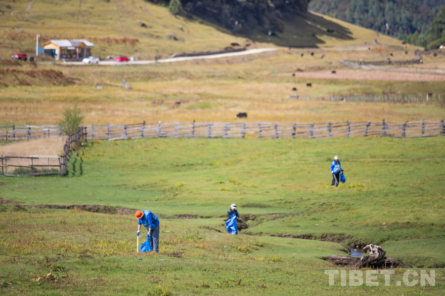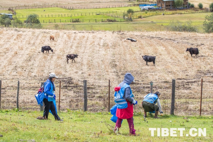圖為譚雪峰(左二)和其他志愿者在魯朗小鎮(zhèn)周邊撿拾垃圾