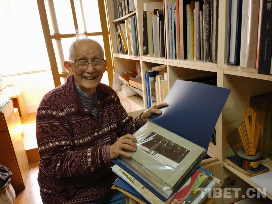 3月21日,我懷揣相冊(cè),專程登門拜訪丁遵新先生。來(lái)到丁先生家,一壁字畫,滿屋書香。92歲高齡的先生,依舊精神矍鑠,思維敏捷。我說(shuō)明來(lái)意,攤開相冊(cè),請(qǐng)先生辨認(rèn)這組西藏照片是否出自他手?先生凝視著照片,一時(shí)語(yǔ)塞,說(shuō):“當(dāng)年湖北團(tuán)只有我一名攝影記者,這些相片肯定是我拍的?!奔?dòng)之余,老先生進(jìn)到書房翻騰了好久,終于又找出兩張當(dāng)年的西藏照片,其中一張為罕見彩色印刷品,加上我母親保存的,總計(jì)12幅。