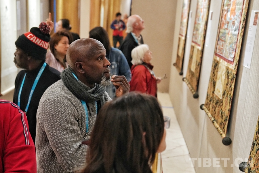 圖為展覽現(xiàn)場觀眾感受唐卡的細(xì)節(jié)