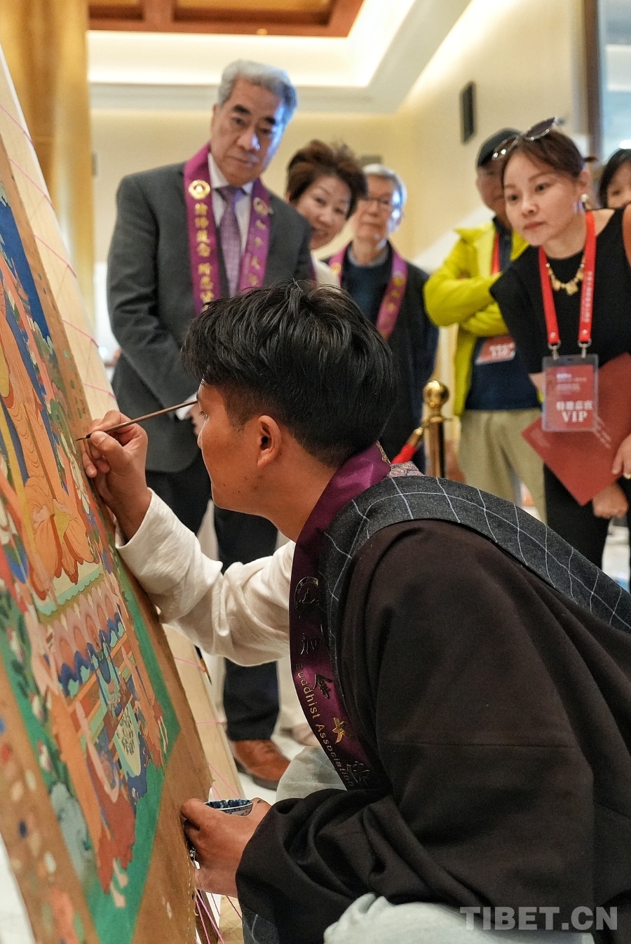 為了提升觀展體驗,展覽特別設(shè)置了“唐卡技藝現(xiàn)場演示”環(huán)節(jié)。壤巴拉非遺傳習(xí)協(xié)會青年藝術(shù)家申支足現(xiàn)場展示傳統(tǒng)唐卡繪制過程,他專注而細(xì)膩的筆觸,讓觀眾得以近距離觀察到非遺技藝的“匠心細(xì)節(jié)”,直觀感受每一幅作品背后所沉淀的時間與文化心血,從而更深入地理解中國優(yōu)秀傳統(tǒng)藝術(shù)的創(chuàng)作邏輯。