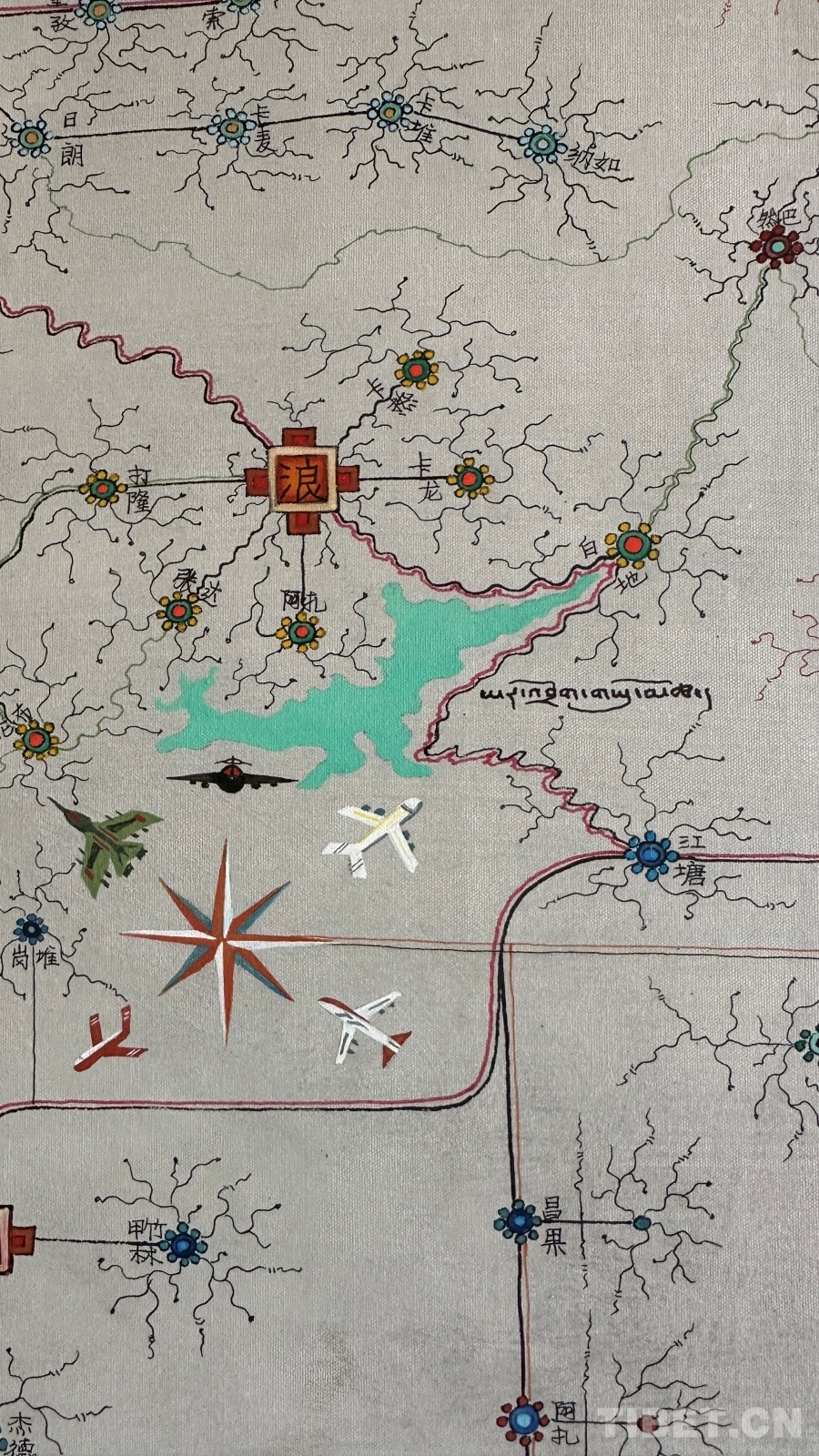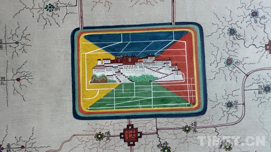 作為一件與地圖密切相關(guān)的作品,達(dá)布主要依據(jù)公路主線和國(guó)家公布的行政區(qū)域進(jìn)行描繪,對(duì)于一些在常用地圖上無(wú)法精確定位的地名,采取了審慎態(tài)度。達(dá)布還追溯了西藏的地圖繪制傳統(tǒng),認(rèn)為可以從著名的《西藏鎮(zhèn)魔圖》開(kāi)始算起。然而,創(chuàng)作中的挑戰(zhàn)并沒(méi)有阻礙他的創(chuàng)作熱情。“畫(huà)著這幅畫(huà),我覺(jué)得這是一個(gè)普通唐卡畫(huà)師用畫(huà)筆感恩當(dāng)下,是對(duì)歷史的真實(shí)記錄,對(duì)偉大工程成果的贊揚(yáng),也是對(duì)傳統(tǒng)唐卡表現(xiàn)形式的突破和思考?!?nbsp;