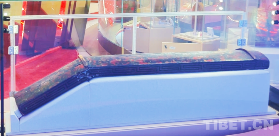 我們看到,雖然歷經(jīng)千年,琴與長鼓仍色澤鮮艷,保存完好。整體呈亞腰形,兩端配備皮帶,可系于腰間,長鼓中間最細(xì)窄之處可系繩便于安置在樂器架上。其表面精巧地髹飾著朱漆與黑漆,巧妙地描繪出寶相牡丹花、云頭紋和火焰紋。而擁有同樣花紋的木琴一端斜下折出鈍角,更見巧思。雖然木琴兩道岳山間原本的琴弦因年代久遠(yuǎn)沒有了,但我們?nèi)苑路鹉芟胂蟮?,入藏后的演奏中,琴弦聲聲,有長安的溫婉綿長,也含雪域的雄渾遼闊,鼓聲陣陣,中原的節(jié)奏與雪域的韻律交織,和鳴穿越時(shí)空,在當(dāng)下奏出和諧樂章。這兩件公主的嫁妝,早已不是單純的器物,更承載著深厚的歷史文化底蘊(yùn),成為民族文化交融的鮮活注腳。
