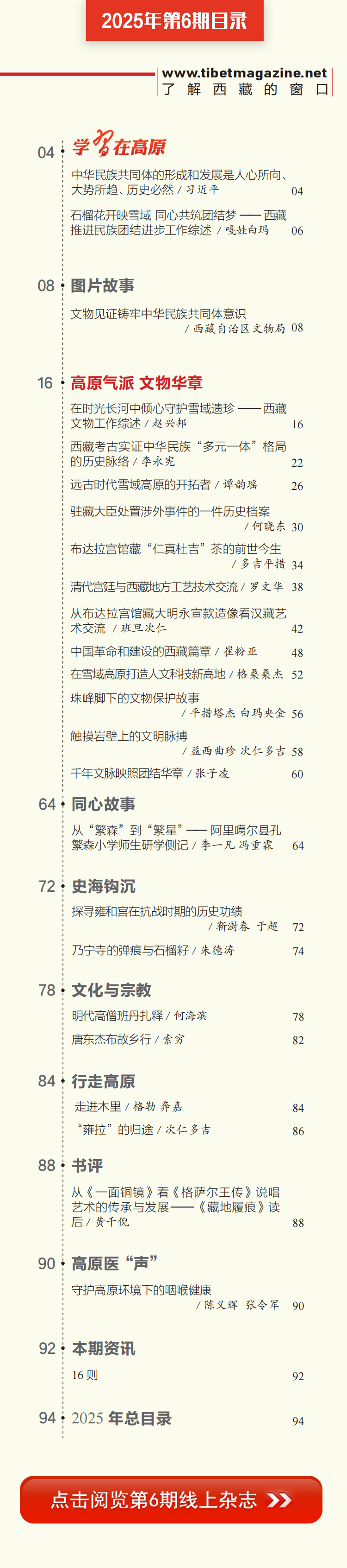 歲聿云暮,秋收冬藏。《中國西藏》漢文版2025年第6期如期與讀者見面了,本期雜志是西藏文物???,得到了西藏自治區(qū)文物局、故宮博物院的大力支持,集納了有關(guān)文稿13篇、圖片90余幅,從文物考古角度追溯各民族交往交流交融的歷史,展現(xiàn)青藏高原文明崛起與民族融合的壯麗詩篇。