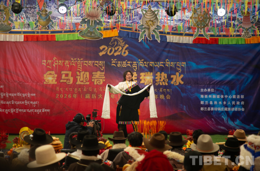 中國西藏網(wǎng)訊 1月16日至17日,在2026年藏歷火馬新年來臨之際,一場主題為“金馬迎春·祥瑞熱水”的藏歷新年晚會在青海省海西蒙古族藏族自治州都蘭縣熱水鄉(xiāng)賽什堂村舉辦并完成錄制。晚會由海西州融媒體中心聯(lián)合熱水鄉(xiāng)黨委、政府及都蘭縣賽瓊鍋莊藏族諺語協(xié)會共同打造,所有節(jié)目均取材于當?shù)剞r(nóng)牧民生活與藝術傳統(tǒng),生動展現(xiàn)了新時代農(nóng)牧民的精神風貌與文化自信。