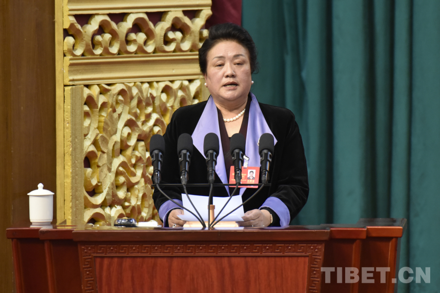 西藏自治區(qū)政協(xié)黨組成員、副主席卓嘎代表政協(xié)第十二屆西藏自治區(qū)委員會(huì)常務(wù)委員會(huì)向大會(huì)報(bào)告政協(xié)十二屆三次會(huì)議以來的提案工作情況。(中國(guó)西藏網(wǎng) 記者/王淑 趙振宇)