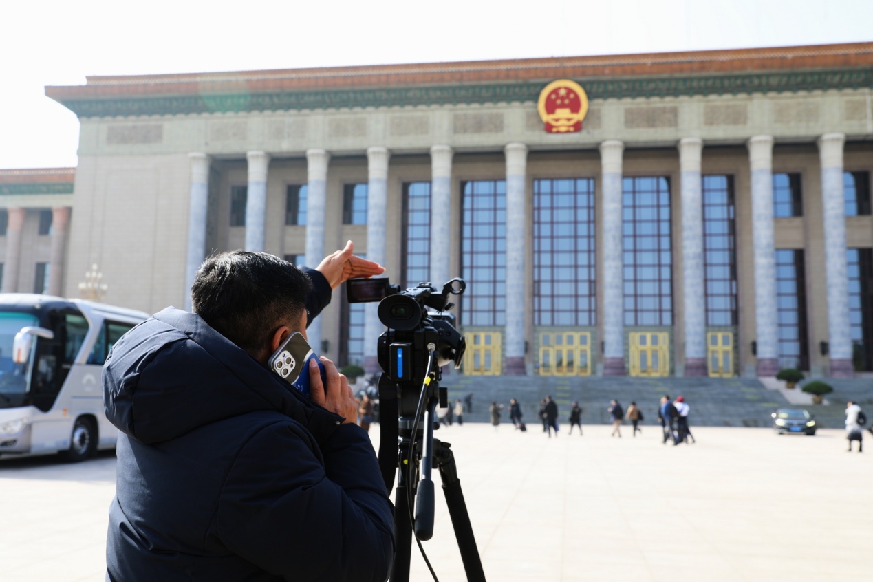 3月3日下午,本網(wǎng)記者在人民大會堂前,準備參加全國政協(xié)十四屆四次會議新聞發(fā)布會。攝影:劉莉