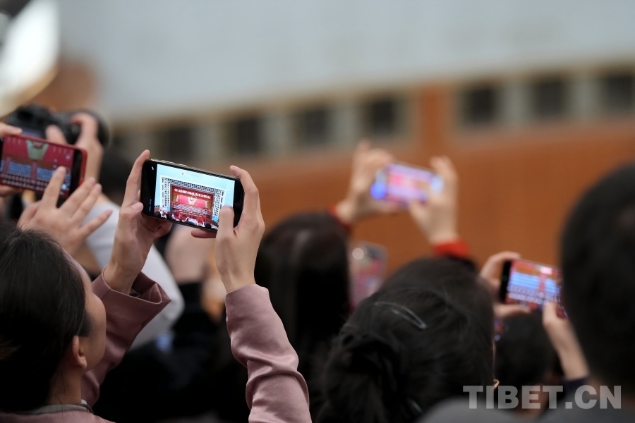3月5日,十四屆全國人大四次會議開幕,記者們用手機(jī)拍攝開幕會。攝影:邊子捷