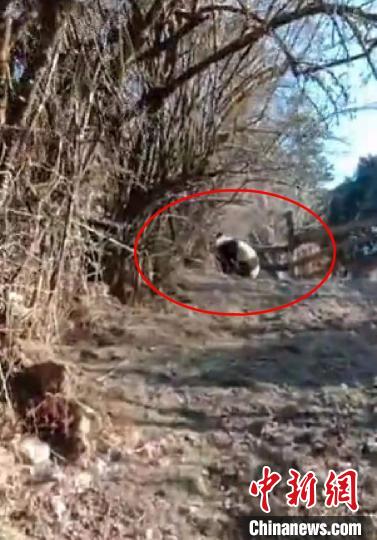 王康忠聞?dòng)嵑螅泵s去現(xiàn)場(chǎng),用手機(jī)拍下了短暫的視頻。視頻顯示,這只野生大熊貓正飛快地向山上跑去。